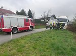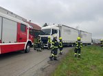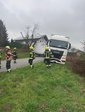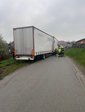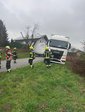 Ein LKW war mit dem Motorwagen ins unbefestigte Gelände abgerutscht, während sich der Anhänger noch auf der Fahrbahn befand.